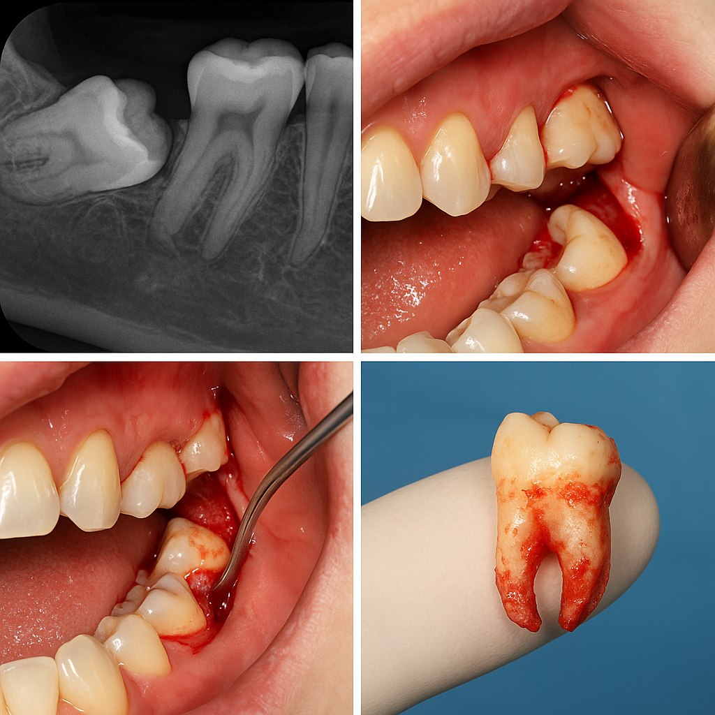 بهویژه در مواردی که دندان افقی یا خمیده است - تمیز کردن محل، بخیه و آموزش مراقبتهای بعد از جراحی